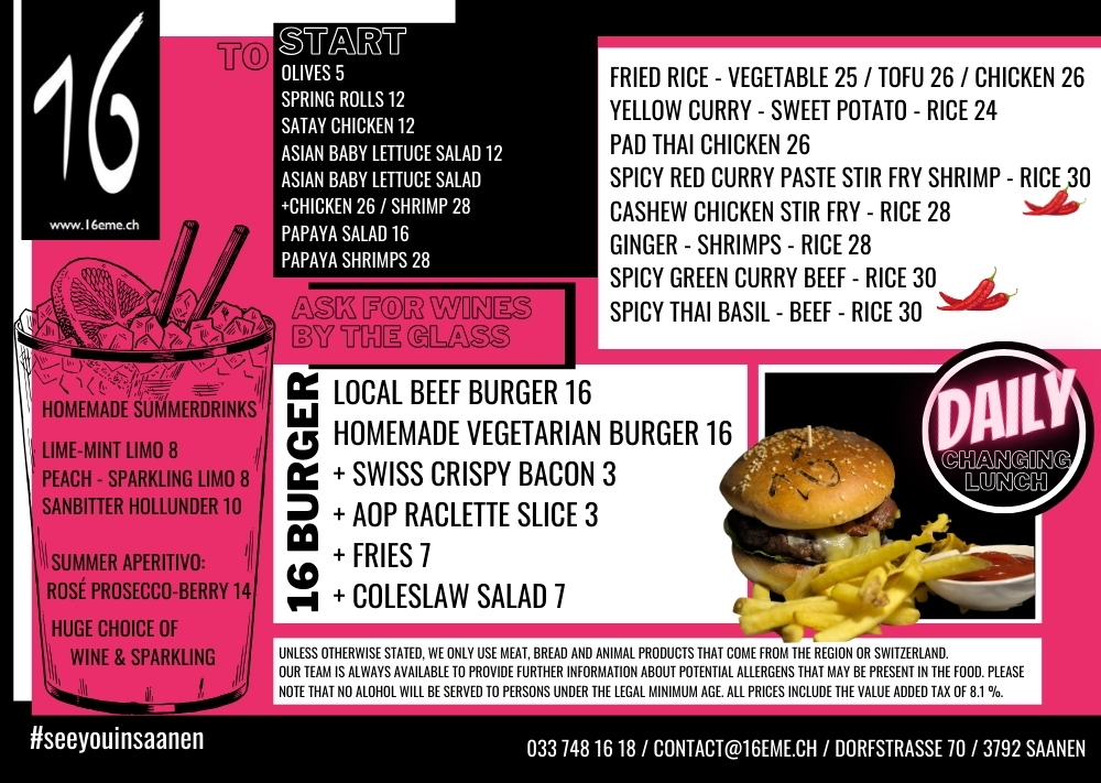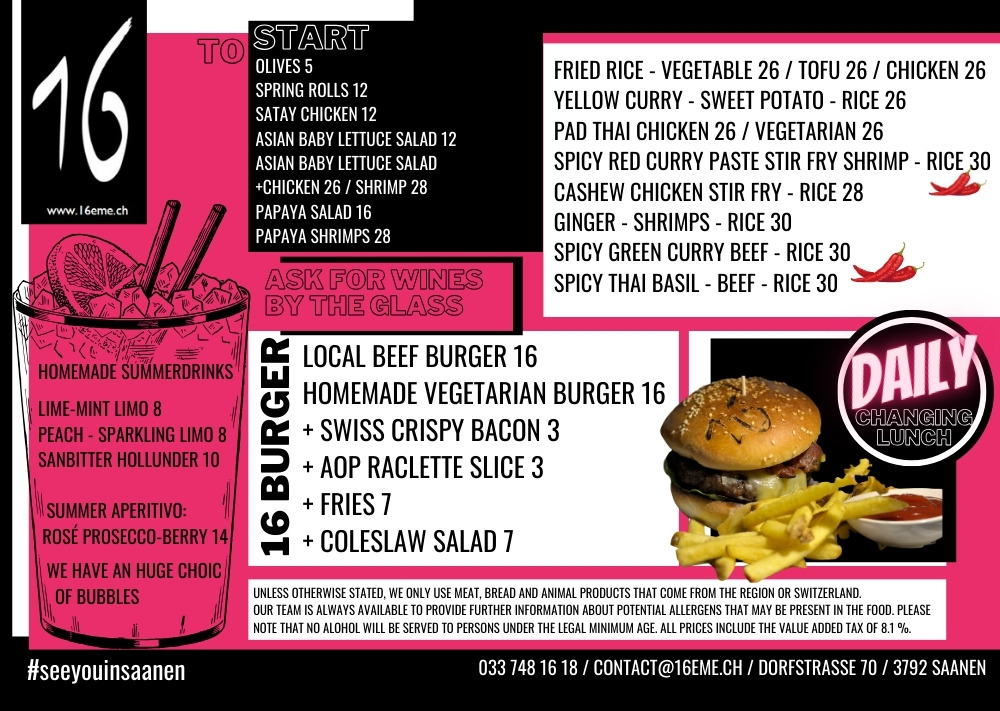 PLEASE CALL 0041 33 748 16 16 TO BOOK A TABLE OR SEND US AN EMAIL TO contact@16eme.ch